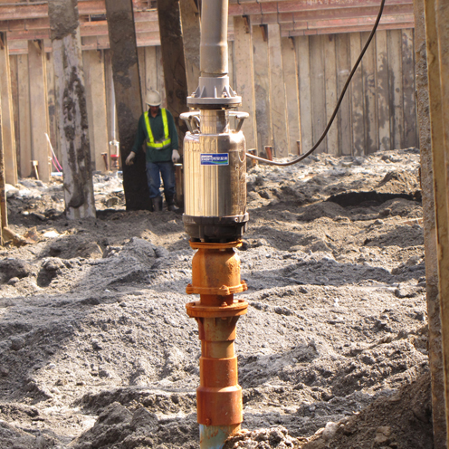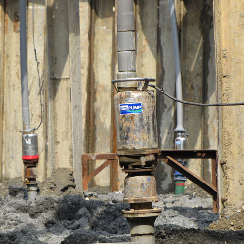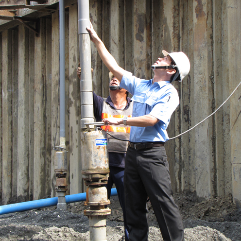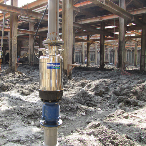 本案为环球购物中心全台第三家分店,坐落于南部市中心,预计将于2012年第四季开幕,占地约一千五百多坪,完工后营运卖场约七千坪,楼高5层;预计开幕后将创造当地上千个就业机会,带动整体商圈活络。此基地开挖面在地下水位之下,为了使开挖面保持稳定状态,以及工作面保持干燥便于施工,因此将地下水位降至开挖面下。本案工程装置数排小口径点井,点井上接竖管及集水干管,使用IC泵浦抽出地下水以降低水位。工程基础束水时间影响后续工程进度极为重要,河见IC水陆两用泵浦系列符合24小时运转要求,并具备铬钢材质叶片,适合含砂水质环境使用,使用寿命大幅延长,可有效的节省后续维修成本。 IC系列为全面水冷式马达,可维持长时间运转,马达省电效率高,防水等级符合IP68国际标准。 IC系列优异的铬钢叶轮设计,可提供高扬程大水量的性能表现及极佳的吸力,适用于井筒抽水;亦可抽水送水两用,取下过滤网接上地下井的水缸,即可为陆上抽水机使用。